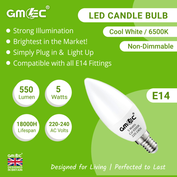 The E14 5W LED Candle Bulb Cool White 6500K delivers crisp, bright illumination in a classic candle shape. Perfect for chandeliers, decorative fittings, wall lights, and modern fixtures, this bulb provides clear daylight-style lighting while maintaining energy efficiency.