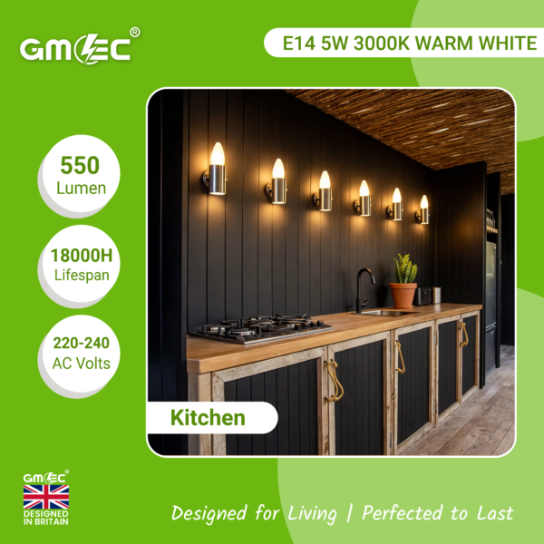 The E14 5W LED Candle Bulb provides warm 3000K light with 550 lumens output, offering up to 85% energy savings and an 18,000-hour lifespan for decorative lighting.