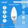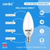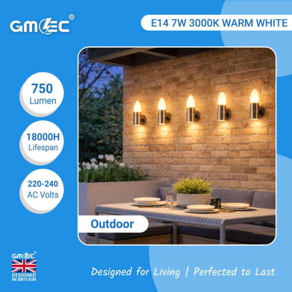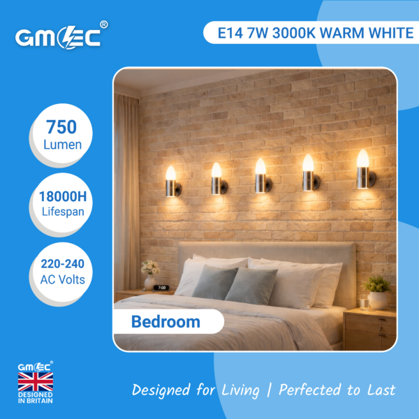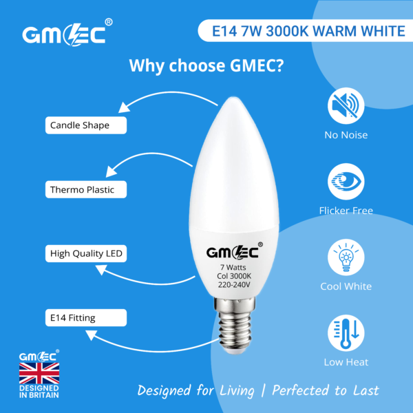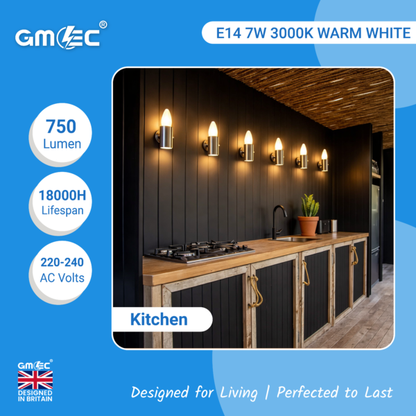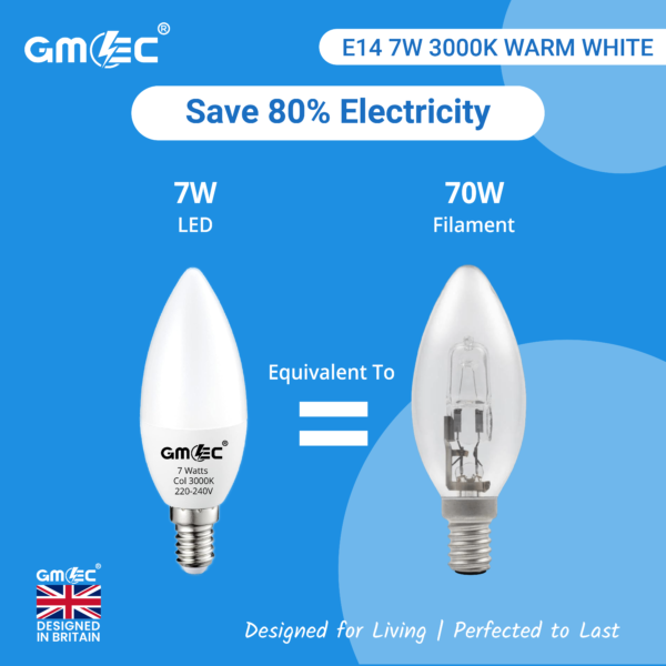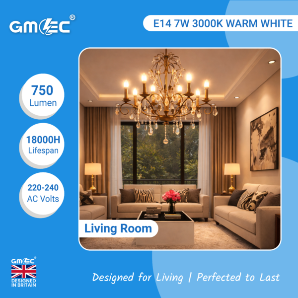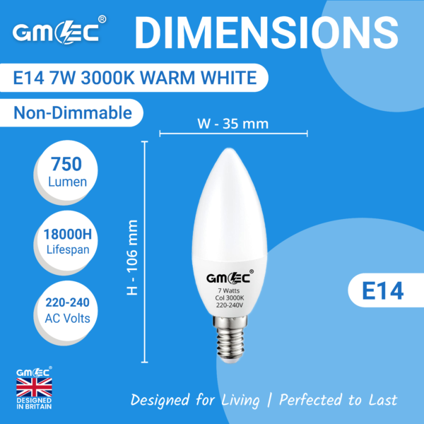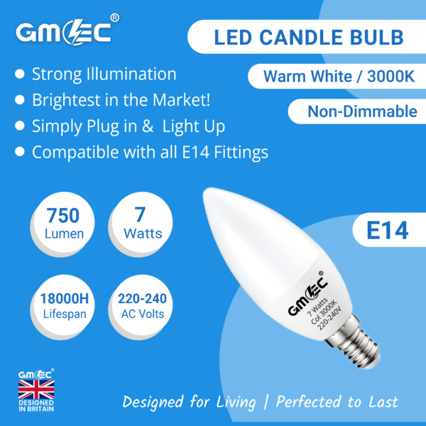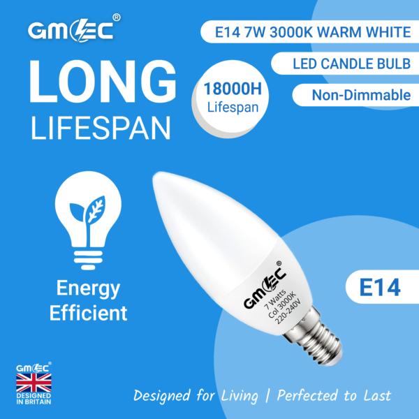 The E14 7W LED Candle Bulb provides warm 3000K light with 750 lumens output, offering up to 85% energy savings and an 18,000-hour lifespan.