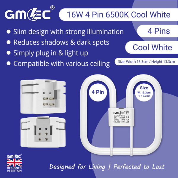 The GMEC 16W 2D Compact Fluorescent Light Bulb (CFL) with GR10Q 4-Pin base is designed for energy-efficient and long-lasting performance. Delivering 1800 lumens of crisp Cool White 7000K light, this bulb is ideal for commercial fittings, bulkhead lights, and exterior luminaires.