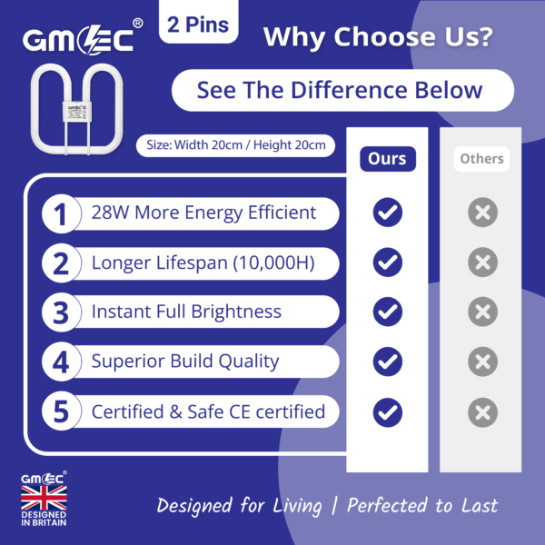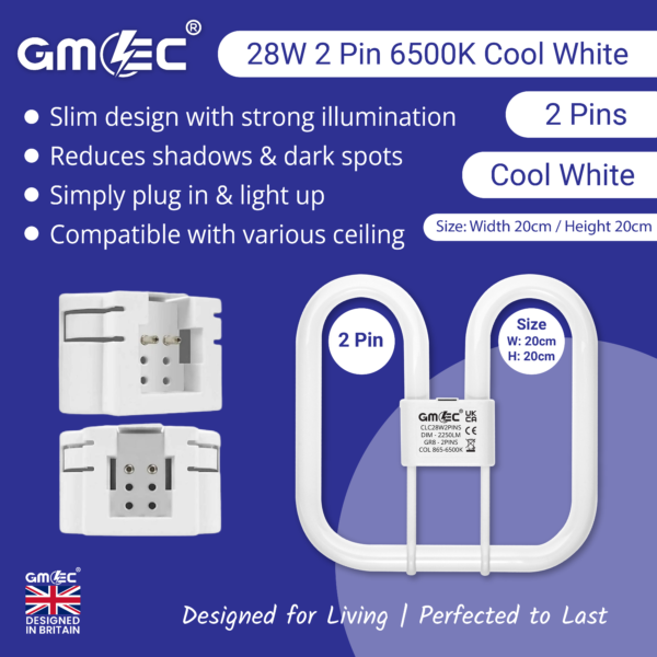 The GMEC 28W 2D Compact Fluorescent Light Bulb (CFL) with GR8 2-Pin base delivers powerful illumination with an impressive 2250 lumens output. Emitting bright Cool White 7000K light, this energy-efficient 2D tube is ideal for commercial bulkhead fittings, corridors, and exterior luminaires.