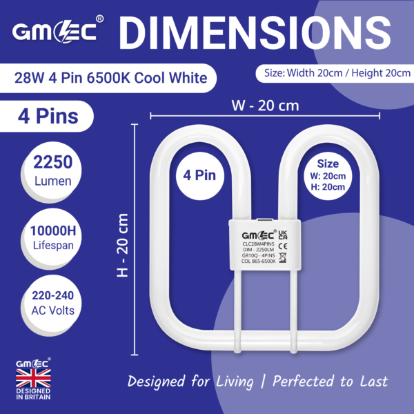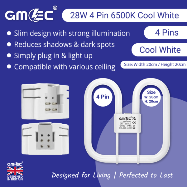 The GMEC 28W 2D Compact Fluorescent Light Bulb (CFL) with GR10Q 4-Pin base delivers strong, energy-efficient illumination with an impressive 2250 lumens output. Emitting bright Cool White 7000K light, this bulb is ideal for commercial bulkhead fittings, corridors, stairwells, and exterior luminaires.