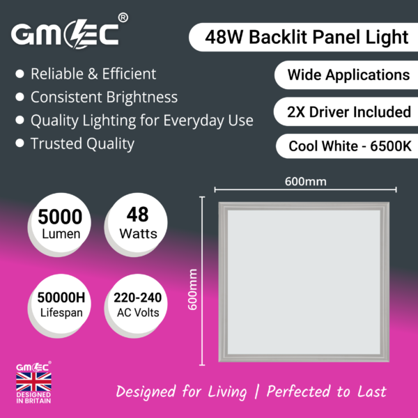 The GMEC 48W LED Panel Light 600×600 delivers powerful and consistent illumination with an impressive 5000 lumens output. Designed for commercial and residential ceilings, this backlit panel light provides bright Cool White 6500K lighting ideal for offices, schools, retail spaces, and work environments.