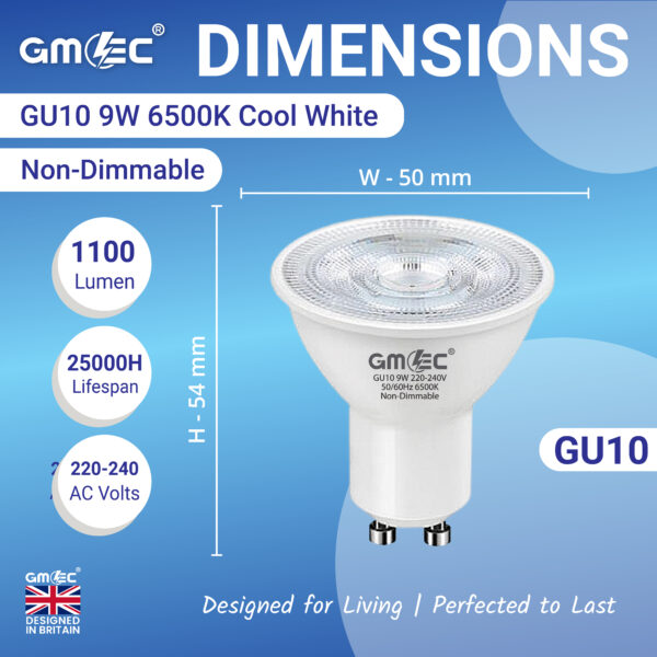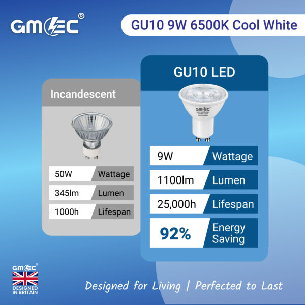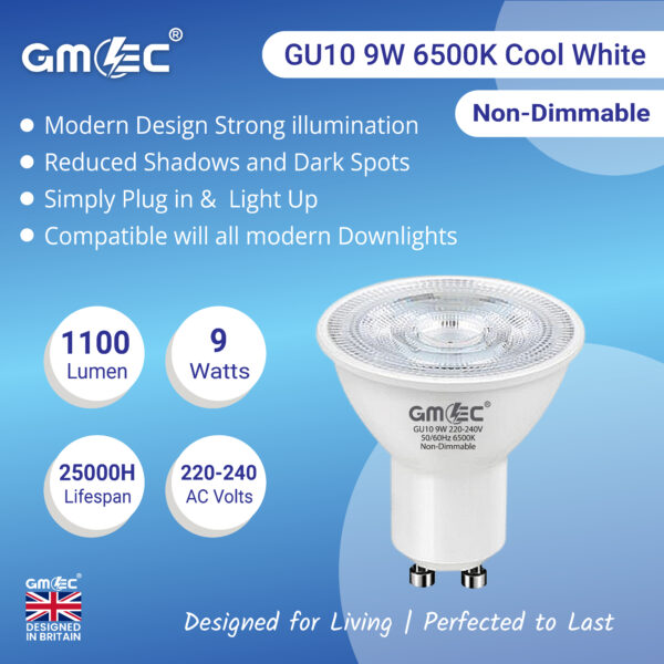 The GMEC 9W GU10 Cool White 7000K LED Bulb is perfect when stronger brightness and sharper clarity are required.