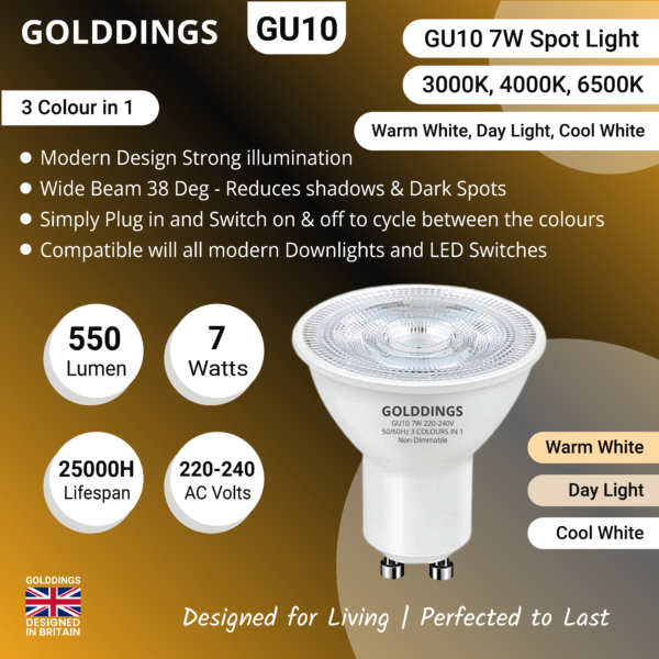 The Golddings 7W GU10 LED Bulb – 3 Colours in 1 gives you complete lighting flexibility in a single spotlight. Easily switch between: