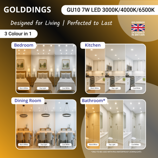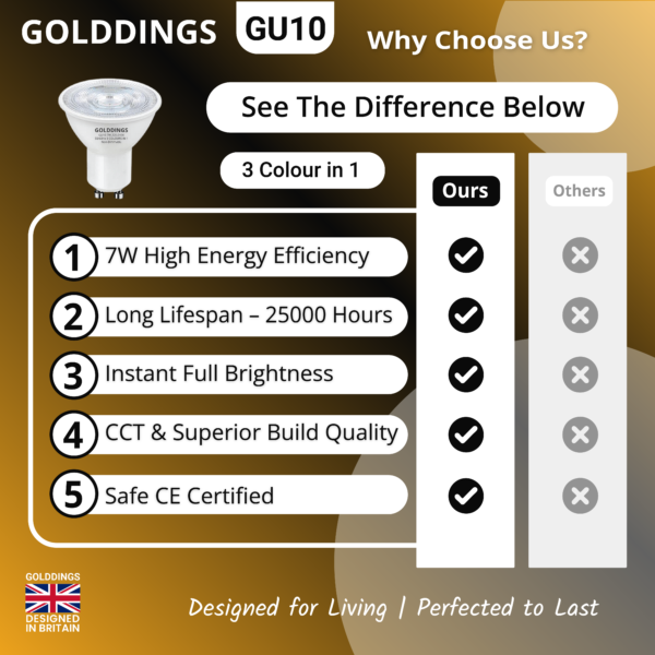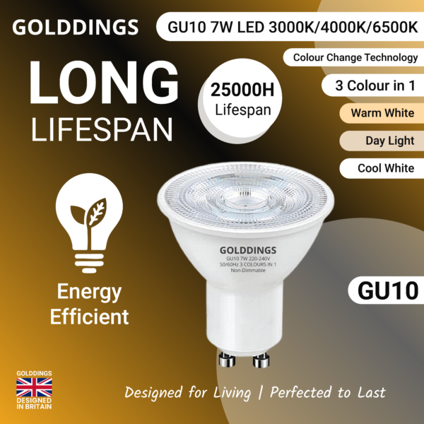 With its 3-in-1 colour selection, the Golddings GU10 LED Bulb is ideal for customers who want adjustable ambience without installing multiple bulb types.